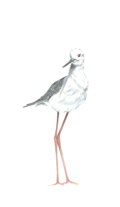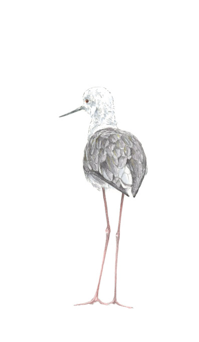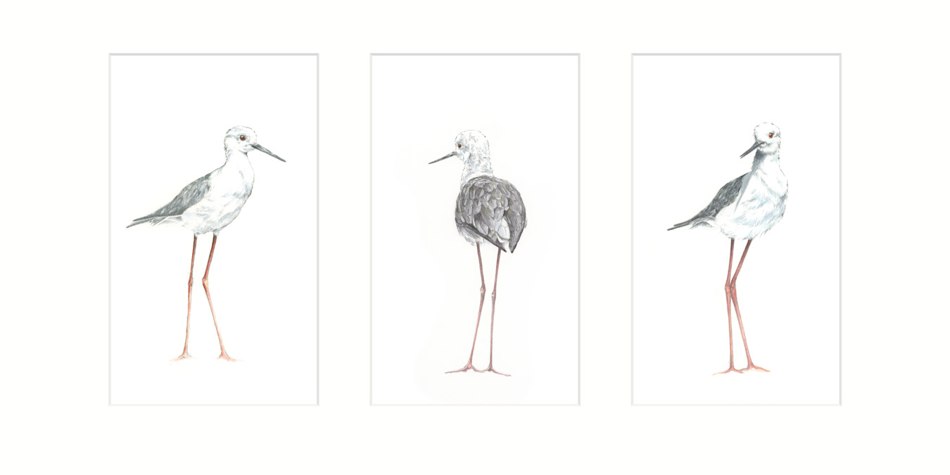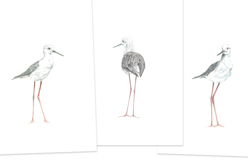 Die zierlichen eleganten Gestalten lassen die Verwendung von nur wenig Aquarellfarbe zu. Vorsichtig wandert der Aquarellpinsel über die Vorzeichnung. Schon bald hat jeder der drei Vögel seinen Glanz erhalten. Charakteristisch für diese Watvögel sind ihre nadelartigen, dünnen Schnäbel und ihre extrem langen roten Beine. Die drei aus der Familie der Säbelschnäbler heißen Stelzenläufer. Sie erreichen eine Körperlänge von 33-36 cm. Ihre Beine, die eine Länge zwischen 14-17 cm erreichen, werden nicht zur Körperlänge gezählt. Stelzenläufer kommen besonders an Küsten in Südeuropa vor. Ihr Lebensraum ist das salzige Flachwasser. Im Winter ziehen sie nach Afrika.